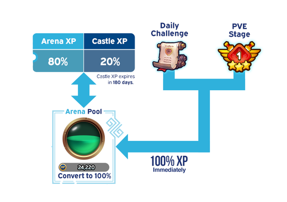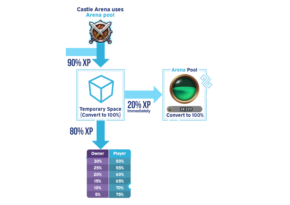 From the Arena Pool, 80% of XP will be distributed to the Arena XP, which will later be used for entry fee for Castle Arena, and 20% to the Castle XP, which will be used for Castle update. But this Castle XPs will expire after 180 days.